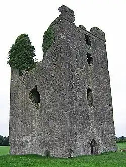 Some sources suggest that the four-storey tower house dates from the mid-15th century and was built by Eoin Carragh MacDonnell (known as "John the Scabbed"), on the site of an earlier castle.[1] Other sources date the structure to the 16th century, noting that it may have been owned by the O'Connor family before becoming a seat of the MacDonnells.[2][3] Associated with the McDonnell family for some time, the last McDonnell to hold Tinnakill was James McDonnell, from whom the site was seized following his role in the Irish Rebellion of 1641.[2] The tower house subsequently fell into disrepair, with some structural works undertaken to protect the ruin in the 19th century.[2]