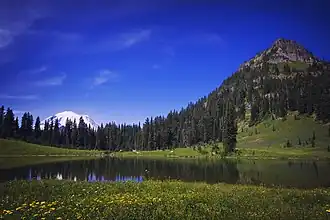 The area is popular with photographers as the shores and surrounding area abound with the vibrant yellow, orange and purple colors of huckleberry, lupine, Indian paintbrush, and Partridgefoot. There are several hiking trails near the lake that vary in degrees of difficulty and that have views of Mount Rainier, Yakima Peak, and the surrounding landscape.[3]