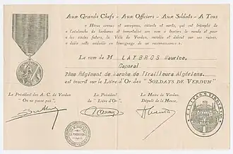 Certificates awarded to a corporal in the tirailleurs algériens for participation in the Battle of Verdun