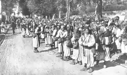 Until 1914 the Algerian and Tunisian tirailleurs wore zouave style uniforms of light blue with yellow braiding (see photographs on this page). White turbans (for parade), red fezzes and sashes were worn with this tenue orientale.[16] A white field dress of similar loose cut was worn for North African campaigning and in France during the early months of World War I.[17] They adopted a more practical khaki uniform from 1915 onwards, in common with the other units of the (North African) 19th Military District.[18][19] The West African and Madagascan tirailleurs wore a dark blue parade dress with red sash and fez while the Indochinese regiments wore an indigenous style of blue, white or khaki uniform with a flat "salacco" headdress.[20] Khaki had been widely worn as a hot-weather field dress in Indo-China and Africa during the years before the outbreak of World War I and thereafter became the norm. The North African tirailleurs however resumed their colourful full dress uniforms between 1927 and 1939 to assist recruitment. After World War II they were retained until the present day for wear by the noubas (regimental bands). [21]