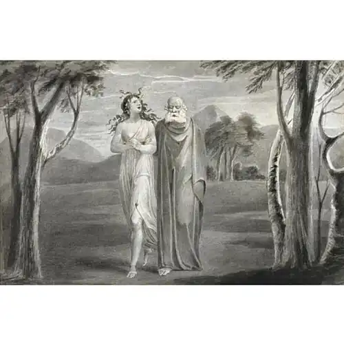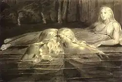 Tiriel is a narrative poem by William Blake, written c.1789. Considered the first of his prophetic books, it is also the first poem in which Blake used free septenaries, which he would go on to use in much of his later verse. Tiriel was unpublished during Blake's lifetime and remained so until 1874, when it appeared in William Michael Rossetti's Poetical Works of William Blake.[1] Although Blake did not engrave the poem, he did make twelve sepia drawings to accompany the rough and unfinished manuscript. However, three of them are considered lost as they have not been traced since 1863.[2]