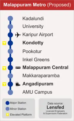 In 2012, Malappuram Metro Rail is a proposed mass transit system for the city by Lensfed[6] (Licensed Engineers & Supervisors Federation). The proposal was considering the future urban scenario which would demand a transport system that can cater to the million plus population of the Malappuram urban agglomeration. In April 2012, Lensfed submitted detailed project report to Government which proposed 8 major stations and 9 intermediate stations out of which three elevated stations at Malappuram Central, Kondotty and Angadipuram. The alignment is similar to the proposed railway line of Calicut-Malappuram-Angadipuram. Apart from this, there is a proposal to extend proposed Kozhikode Light Metro Rail network to Malappuram during its third phase of expansion, paving a way to Calicut-Malappuram 'Urban Corridor' concept