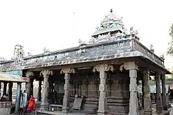 Paasupatheeswarar temple is located in Annamalai Nagar, a place 2 km (1.2 mi) from Chidambaram and inside the premises of Annamalai University. The temple has a three tiered rajagopuram on the eastern side with concentric rectangular walls surrounding the temple. The sanctum is approached through a pillared hall called mukha mandapa and an artha mandapa. The shrine of the goddess is located in the mukhamandapa facing south. The presiding deity in the form of lingam (an iconic form of Shiva) is located in the sanctum. There is a circumabulatory passage around the shrines. The pillars in the hall leading to the sanctum has sculpted images depicting various Hindu legends. The pillared halls in the hall has legends of Arjuna doing penance.[1] The image of Parvati with her hair unlocked is a notable feature.[3] The metal image of Arjuna getting Pasupathasra from Shiva is housed in the temple.[4]