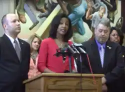 A grassroots group of supportive activists calling themselves "Draft Tishaura" helped convince Jones to run for Mayor of St. Louis in 2017.[14] On November 17, 2016, Jones announced her candidacy in the 2017 mayoral election.[52] During the campaign, she received endorsements from the Coalition of Black Trade Unionists,[53] Democracy for America,[54] Missourians Organizing for Reform and Empowerment,[55] MoveOn,[54] NARAL Pro-Choice America,[53] the Service Employees International Union,[53][54] the Working Families Party,[56] and the Young Democrats of St. Louis,[53] as well as by St. Louis Alderman Chris Carter III,[53] Missouri Secretary of State Jason Kander,[53] Missouri State Senator Jamilah Nasheed,[53] and St. Louis County Assessor Jake Zimmerman.[53] In the Democratic primary on March 7, 2017, Jones finished in second place with 30.4 percent of the vote, losing to Lyda Krewson, who won with 32 percent of the vote.[57] The race was noted for its low turnout,[57][58] and many commentators speculated that the outcome was racial in nature.[b][57][58][59][60][61][62] On April 4, Krewson won the general election.[63]