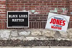 Black-and-white photograph of a yard sign promoting Jones's 2017 mayoral campaign, reading "Tishaura O. Jones for Mayor #OneStLouis"