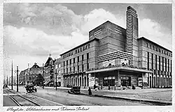 The Titania-Palast was designed by Ernst Schöffler, Carlo Schlönbach and Carl Jacobi, in the New Objectivity style, featuring a 30 metres (98 ft) "light tower", and a large Art Deco foyer. It was both a cinema and a theatre, seating 1,924, with space for an orchestra of up to 60 musicians. There was also a café seating 350. It opened on 26 January 1928. The first film shown was the silent film The Story of a Little Parisian, starring Carmen Boni. The first sound film shown was The Singing Fool starring Al Jolson, shown on 29 October 1929. The first German-language sound film shown, on 21 November 1929, was The Royal Box, starring Alexander Moissi.[2][3][4]