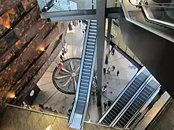 The interior of the eight-storey building provides 12,000 square metres (130,000 sq ft) of space.[8] Its centrepiece is a series of interpretive galleries exploring aspects of the building, design, sinking and legacy of Titanic. On the top floor of the museum is Belfast's largest conference and reception space, the Titanic Suite, a banqueting facility capable of seating 750 people. A reproduction of the original staircase on the Titanic, made famous by the James Cameron film Titanic in 1997, is located in this conference centre.[20] Project director for interior architects Kay Elliott, Mark Muir proposed that a replica-like Titanic's staircase could be made for the building. The staircase was brought in as a focal point, a stage and a VIP route. There were no drawings of the historic staircase and current accessibility and health and safety standards still had to be satisfied. 10,000 individual parts make up the staircase which weighs nearly four tonnes.