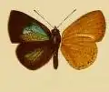 1. ^ Sands, D. P. A. (1979). "NEW SPECIES OFPHILIRISRÖBER (LEPIDOPTERA: LYCAENIDAE) FROM PAPUA NEW GUINEA". Australian Journal of Entomology. 18 (2): 127–133. doi:10.1111/j.1440-6055.1979.tb00824.x. ISSN 1326-6756. Eliot (1973) separated two species, P. sublutea (Bethune-Baker) and P. caerulea Tite from New Guinea, placing them in a new genus Titea and showed that Philiris, Titea, Parachrysops Bethune-Baker, Hypochrysops C. and R. Felder, and Waigeum Staudinger were a closely related group of genera within the tribe Luciini