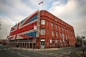 ![]() The Tobacco Factory during cleaning work which saw a Union Jack flag covering scaffolding | |