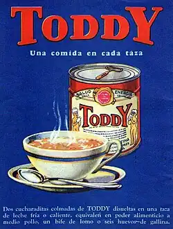 Toddy became an instant success. Advertised as a "drinkable food", as a substitute for milk. Nevertheless, Rudhard wanted to expand his business, mainly to Canada and Mexico. Unable to solve some legal issues for the commercialisation outside the U.S., Rudhard decided to franchise the product. In 1928, one of his employees, Puerto Rican Pedro Erasmo Santiago, took over concession for Latin America market, focusing on children as Toddy's main target. That strategy gave good result, mainly in Mexico and Argentina. In 1949, the slogan was: "Toddy, breakfast for the whole family"[4]