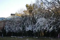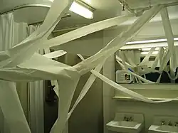Toilet papering (also called TP-ing, house wrapping, yard rolling, or simply rolling) is the act of covering an object, such as a tree, house, or another structure with toilet paper. This is typically done by throwing numerous toilet paper rolls in such a way that they unroll in midair and thus fall on the targeted object in multiple streams. Toilet papering can be an initiation, a joke, a prank, or an act of revenge. It is common in the United States and frequently takes place on Halloween, April Fools' Day, or after the completion of school events such as graduation or the homecoming football game.[1]