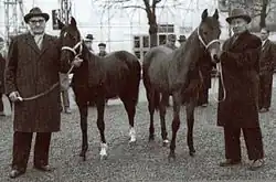 ![]() Toivo Pohjala (left) and harness racing driver Tuomo Mäkelä with two Orlov mares | |