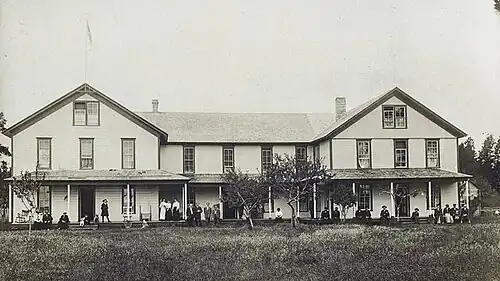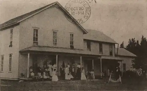 1905 view of the Tokeland Hotel from the south. The Kindred farmhouse is the two and half story structure on left. In 1899, the addition to the right was added, creating an "L" shape to the building.