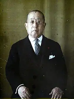 Prince Tokugawa Iesato (徳川 家達; August 24, 1863 – June 5, 1940) was the first head of the Tokugawa clan after the overthrow of the Tokugawa shogunate, and a significant figure in Japanese politics and diplomacy during the Meiji, Taishō and early Shōwa period of Japan. When Prince Tokugawa travelled to other nations representing Japan during his diplomatic journeys, he usually presented his name as Prince Iyesato Tokugawa.[1] For 30 years, Prince Tokugawa held office as President of the House of Peers, the upper chamber of Japan's National Diet. In this capacity, Tokugawa promoted democratic principles and international goodwill. It was only after his death in 1940 that Japanese militants were able to push Japan into joining the Axis Powers in World War II.[2][3]