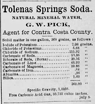 - ^ a b "Tolenas Soda Springs". Oakland Tribune. December 1, 1963. p. 124. Retrieved 2024-01-29.