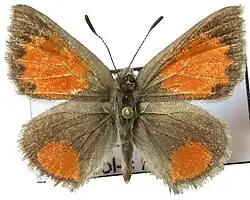 T. callimachus Ev. (= epiphania Boisd., hafis Koll.) (75 e). Above bright fiery cinnabar-red, margins and base of wings black, fringes chequered with brown. Hindwing beneath earth-brown, fasciated with dark brown and minutely dotted with black. Coasts of the Black Sea, Persia and Ferghana. — In the form dentata Stgr., from northern Mesopotamia and Asia Minor, the black distal margin of the wings is very strongly dentate and the hindwing beneath is grey-brown. — Larva reddish yellow-brown, with dark dorsal line and pale lateral one, between which there is a dark stripe composed of small oblique spots; on Astragalus physodes. The butterflies in April and May on hills, not rare.[1]