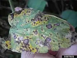 Symptoms of tomato leaf mold appear usually with foliage, but fruit infection is rare. The primary symptom appear on the upper surface of infected leaves as a small spot pale green or yellowish with indefinite margins, and on corresponding area of the lower surface, the fungus begins to sporulate.[5] The diagnostic symptom develops on lower surface as an olive green to grayish purple and velvety appearance, which are composed of spores (conidia).[6] Continuously, the color of the infected leaf changes to yellowish brown and the leaf begins to curl and dry. The leaves will drop upon reaching a premature stage, and the defoliation of the infected host will cause further infection. This disease develops well in relative humidity levels above 85%. When the temperature reaches optimum level for germinating, the host will be infected by the pathogen. Occasionally, this pathogen causes disease on the fruit or blossoms with various symptoms.[7] Fruits such as green and ripe one will develop dark rot on the stem. The blossoms will be killed before fruits grow.