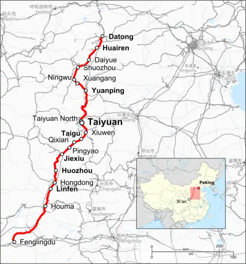 The Datong–Puzhou or Tongpu railway (simplified Chinese: 同蒲铁路; traditional Chinese: 同蒲鐵路; pinyin: tóngpǔ tiělù), is a major trunkline railroad in northern China, and the main axial railway of Shanxi Province. The railway is located entirely within Shanxi and diagonally bisects the province from Datong in the northeast to Fenglingdu, near the village of Puzhou, in the southwest corner. The line is named after Datong and Puzhou, and has a total length of 865 km (537 mi). The line is often referred to by its northern and southern halves with Taiyuan, the provincial capital as the midpoint. Southern Tongpu railway from Taiyuan to Fenglingdu is 513 km (319 mi) in length and was built from 1933 to 1935. The Northern Tongpu railway, from Datong to Taiyuan is 351 km (218 mi) in length and was built from 1933 to 1940. Major cities and towns along route include Datong, Huairen, Shuozhou, Ningwu, Yuanping, Xinzhou, Taiyuan, Yuci, Taigu, Qi County, Pingyao, Huozhou, Hongdong, Linfen, Houma and Fenglingdu.