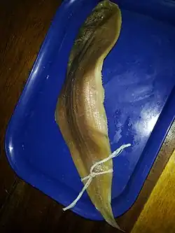 Tonguefishes are flatfish in the family Cynoglossidae. They are distinguished by the presence of a long hook on the snout overhanging the mouth, and the absence of pectoral fins. Their eyes are both on the left side of their bodies, which also lack a pelvic fin.[2] This family has three genera with a total of more than 140 species. The largest reaches a length of 66 cm (26 in), though most species only reach half that size or less.[3][4][5] They are found in tropical and subtropical oceans, mainly in shallow waters and estuaries, though some species are found in deep sea floors,[6] and even a few in rivers.