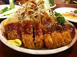 Tonkatsu sauce or katsu sauce is a Japanese sauce served with tonkatsu (pork cutlet). It is a thick (viscosity over 2.0 pascal-second, per JAS Standard) Japanese Worcestershire-type sauce. It is similar to the British and Irish brown sauce, and can include a fish sauce, tomatoes, prunes, dates, apples, lemon juice, carrots, onions, and celery among its ingredients.[1][2]