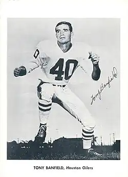 Tony Banfield (December 18, 1938) is an American former professional football player who was a defensive back for the Houston Oilers of the American Football League (AFL).[1] He played college football for the Oklahoma State Cowboys. He played for Houston in the AFL from 1960 through 1963 and in 1965. In 1962, he returned a blocked punt 58 yards for a touchdown in the Oilers' 32–17 defeat of the Oakland Raiders. He was All-AFL in 1961 and 1962 and an American Football League Eastern Division All-Star in 1963. Banfield played in the first three AFL Championship games, winning the title in 1960 and 1961.
