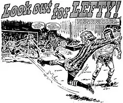 Harding drew various strips for Roy of the Rovers between 1976 and 1993, but it was only in the annuals that he got to illustrate the adventures of Roy Race himself. In 1976–77 he drew the controversial football strip "Look Out For Lefty", written by Tom Tully, for Action, taking over from his friend Barrie Mitchell. Harding regarded it as a "cheeky", humorous story,[8] but objected to some of the things he was asked to draw, for example refusing to depict Lefty sticking two fingers up to the crowd.[9] He did draw a scene involving a character throwing a bottle from the crowd and hitting a player on the head, thinking the player was "such a horror" he deserved it.[8]