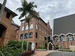 On 1 February 1902, Clayfield Boys' College was established on Old Sandgate Road (now Bage Street) near the Wesleyan Church at Eagle Junction by Arthur (Barney) Rudd with an initial enrolment of 4 students.[30][14] In 1909, it began to accept boarding students. In 1912, the school moved to a new location on the corner of Bayview Terrace, Clayfield, near the tram terminus.[31] In July 1918, the school was purchased by the Presbyterian and Methodist Schools Association and renamed Brisbane Boys' College.[32] In 1931, the school relocated to its current campus in Toowong with 193 students.[33][34]