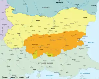 As compensation, the Ottoman Empire received the area around Kardzhali, as well as the Republic of Tamrash, for a total area of 1,640 km2. With this treaty, the territory of the unified Bulgaria became 94,345 km2.[3] Bulgaria later regained the lands lost in this treaty following victory in the First Balkan War (1912–13).