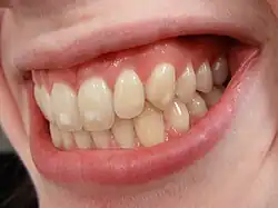 Dental fluorosis is a dose-dependent adverse drug effect featured by temporary white marks.[5] It can be induced by increased fluoride exposure, typically from stannous fluoride-containing products or fluoridated water.[5][20] Excess intake of fluoride leads to overabundance of structurally-weak fluorapatite formed inside the enamel, resulting in increased brittleness of teeth.[21] In severe dental fluorosis, brown or yellow staining may appear on teeth.[8] Children under the age of eight are susceptible to dental fluorosis.[8]