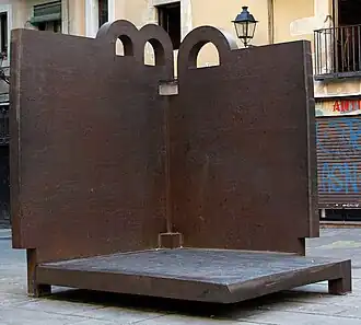 Topos V is cast in iron. Its geometrical shape reproduces a Dihedral angle, closed on two of its sides. The two open sides face the square. In addition, some round shaped forms that could evoke the B, for "Barcelona", and medieval arches or windows as well, complete the elements allowing a perfect complementarity between contemporary sculpture and medieval architecture.