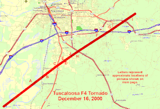 On December 16, 2000, a destructive tornado outbreak hit the Southeastern United States, from Mississippi to North Carolina. The most significant tornado of the outbreak occurred in communities south and east of Tuscaloosa, Alabama. The F4 tornado killed 11 people and injured more than 125 others; it was the strongest tornado to hit the state of Alabama in the month of December since 1950.