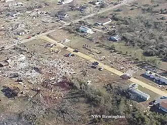 ![]() Damage to trees, homes, and trailers south of Tuscaloosa, Alabama. | |