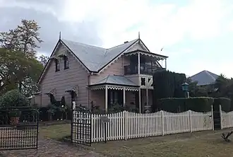 Full width timber verandahs extend across both the front and rear elevations of the house and a small upper level balcony projects from its front gable. The verandahs and the balcony all have hipped roofs clad in corrugated iron. The front verandah and balcony both feature decorative scalloped valances. The balcony has cast iron balustrading and immediately beneath it is the main entrance to the house, highlighted by a wide valance decorated with tracery. The front verandah area is almost entirely screened with lattice, while the rear verandah is currently glazed and has been partly enclosed to form a modern bathroom.[1]