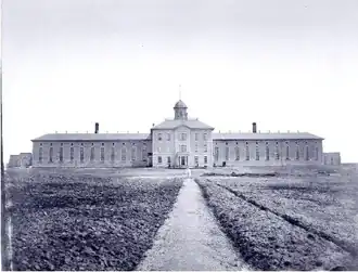 The prison should have flourished as an example of modern penal facility of its time, but by the 1880s it had a well-deserved reputation for brutality. Its first warden, William Stratton Prince, was an alcoholic ex-military officer who resigned as chief of the Toronto Police to take the position. During his tenure he was accused of ordering extreme beatings, denying medical treatment, and supporting clandestine, nighttime burials. Wardens that followed tried to adopt a less disciplinarian approach, but the guards continued to brutalize the inmates.[1] In 1911, Dr. J.T. Gilmour, one of the more reformist wardens, made news in the United States with his new outdoor work program, specifically one that allowed inmates to work without armed guards.[2] Dr. Gilmour's reforms were not enough to overcome the prison's reputation. The Toronto Historical Association sums up the facility's reputation: "Central Prison represents one of the most shameful parts of the city's history, and its severe conditions and brutality are shocking".[3]