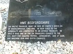 Bedfordshire was a 443-ton British trawler. On May 10, Bedfordshire and HMT Lowman were deployed from their base at Morehead City to Ocracoke Island to search for a U-boat spotted in the area. When the vessels arrived they were discovered by Captain Lieutenant Gunther Krech of U-558 who proceeded to shadow the vessels until later that night. Krech attacked after assuming he had been detected by the British ships - firing a spread of torpedoes at the Lowman but they all missed. The British then maneuvered and began dropping depth charges but these failed to destroy their target. At 5:40 in the morning on May 11, the U-boat fired a single torpedo at Bedfordshire which missed but a second hit the trawler and it quickly sank with all thirty-seven hands. Two bodies were eventually recovered by the Americans who buried the dead on Ocracoke, creating the British Cemetery there.[5][21]