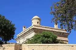 The Torre dello Standardo's design is similar to the coastal watchtowers such as the De Redin towers that the Order built in Malta during the 17th century.[17] It has the same basic layout, with two floors and a scarped base.[17] However, this tower is of finer construction than the coastal towers, having decorative Baroque elements such as mouldings, as well as escutcheons containing the coats of arms of De Vilhena and the city of Mdina.[17] The sculptural details are the work of Francesco Zahra.[18] The tower has a cylindrical stair-hood with a dome, and this feature is similar to that found at Palazzo Stagno and the now-demolished Gourgion Tower.[17]