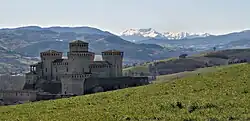 The castle was built as a defensive fortification and as a noble residence for de Rossi's mistress, Bianca Pellegrini d'Arluno.[1] Bianca died in Torrechiara around the year 1480. Pier Maria retired to Torrechiara in 1482, where he died later that year. They were both buried in the castle, in the Oratory of San Nicomede in the north-east tower.[2]