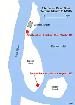 The Torrens Island Internment Camp was a World War I concentration camp,[1] located on Torrens Island in the Port River Estuary near Adelaide in South Australia. The camp opened on 9 October 1914 and held up to 400 men of German or Austro-Hungarian background, or crew members of enemy ships who had been caught in Australian ports at the beginning of the war. They were held without trial under the provisions of the War Precautions Act 1914.