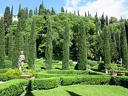 Slightly further south, on the western slopes of the hill is the Giusti Garden, a late Renaissance Italian garden built on the back of the 16th-century Giusti del Giardino palace. The park climbs the hill on several terraces planted with box, cypress and citrus trees, and embellished with labyrinths, fountains, mythological statues, stairways and artificial grottoes. The cliff of the hill, on the other hand, is kept as an evergreen forest: from there one reaches a belvedere balcony above a mascaron and a covered pavilion from which there is a view of the entire city.[54]