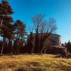The hill, a natural continuation of the San Mattia ridge, lies between the extreme valley floor of Avesa to the west (occupied today by the Pindemonte neighborhood) and the Valdonega neighborhood to the east.[30] On the highest peak (170 m) rises the shrine of Our Lady of Lourdes, built between 1958 and 1964 to a design by architect Paolo Rossi de Paoli on the centenary of the famous apparitions. The church was built by repurposing the former Austrian fort of San Leonardo, the forms of which are still clearly discernible in the circular plan of the worship building, one of the most iconic elements of the Torricelle hillside landscape. The fort, designed like the nearby Fort San Mattia in 1838 under the direction of Franz von Scholl, was granted in 1952 by the state property to the Congregation of the Stigmatine Fathers to relocate to it the shrine of Lourdes previously located in Piazza Cittadella in the city center, which had been destroyed by bombing in World War II. The new church would house the statue of the Immaculate found intact in the rubble, the work of sculptor Ugo Zannoni. From the square in front of the church, where the modern "grotto" with the statue of Our Lady stands, there is a view of the plain from the city center to the suburbs and the surrounding countryside.[31][32]