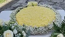 Torta mimosa is an Italian dessert first created in the comune (municipality) of Rieti, Lazio, in the 1950s.[1] The name is given by the small pieces of sponge cake scattered on the surface, which resemble mimosa flowers in shape. Thanks to the flower's connection with International Women's Day, the cake is also often used to celebrate this occasion.