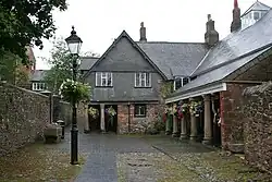 The ancient Leechwell, so named because of the supposed medicinal properties of its water, and apparently where lepers once came to wash, still provides fresh water. The Butterwalk is a Tudor covered walkway that was built to protect the dairy products once sold here from the sun and rain.[47] Totnes Elizabethan House Museum is in one of the many authentic Elizabethan merchants' houses in the town, built around 1575.[48]