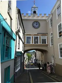 The Norman motte-and-bailey Totnes Castle, now owned by English Heritage, was built during the reign of William I, probably by Juhel of Totnes.[33] The late medieval church of St Mary with its 120-foot-high (37 m) west tower, visible from afar, is built of rich red Devonian sandstone.[33] A prominent feature of the town is the Eastgate—an arch spanning the middle of the main street. This Elizabethan entrance to the walled town was destroyed in a fire in September 1990, but was rebuilt.[46]