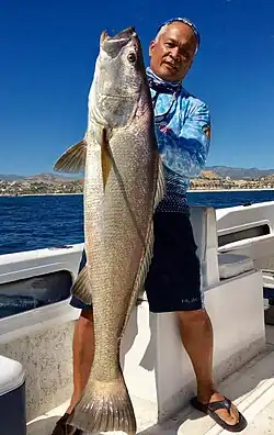 While there is no formal compilation of the color, shape, or other characteristics besides size and weight of the totoaba, a website dedicated to the photography and species information of Mexican fishes has compiled a cohesive enough species description of the totoaba. The totoaba can reach a size of up to 2 metres (6.6 ft) and weight of 135 kilograms (298 lb).[8] The totoaba coloration is silvery with darker fins and a light belly.[9] There is no sexual dimorphism between the males or females.[8] The juveniles tend to be spotted in comparison to the adults, specifically having a spotted second dorsal fin.[9] The totoaba have an elongated compressed fusiform body shape with a terminal oblique mouth and lower jaw that projects slightly.[9] The totoaba has two dorsal fins with a clear separation between them. The anterior dorsal fin is a spinous portion, and the posterior dorsal is a soft-rayed portion providing balance, maneuverability, and protection. Its pectoral fins are located towards the head of the fish right behind the operculum and are exceedingly long with the pelvic fins located right beneath it. Its anal fin is located before the peduncle and its caudal fin most closely resembles a truncate shaped tail.