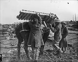 During the subsequent pursuit to the River Selle, 19th Bde, accompanied as usual by 11th Field Company, and by detachments of artillery, cavalry and machine guns, advanced rapidly, clearing a succession of villages until it met strong opposition at the river itself. The brigade made an advance of seven and a half miles in a few hours on 9 October.[27][28] During the night of 11/12 October, 11th and 212th (Tottenham) Field Companies, under the CRE, brought down their pontoon wagons and built 12 footbridges (two for pack horses) over the Selle, with little interference from the enemy and suffering only two casualties as the German machine-gun fire was high. The infantry crossed the bridges as soon as they were ready, and formed up on the eastern bank ready to assault at 05.00. However, a German counter-attack drove them back across the river by the end of the day.[29][30]