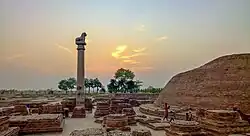 The first significant architectural pieces in Bihar date back to the Vedic period. While the Mauryan period marked a transition to the use of brick and stone, wood remained the material of choice. Evidence of ancient structures have been found in recent excavations in Kumrahar, in modern-day Patna. Remains of an 80-pillared hall have also been unearthed. The Buddhist stupa, a dome-shaped monument, was and is used in Bihar as a commemorative monument used to enshrine sacred relics.[17] Many stupas, like those at Nalanda and Vikramshila, were originally built as brick and masonry mounds during the reign of Ashoka (273 BCE - 232 BCE). Fortified cities with stūpas, viharas, and temples were constructed during the Maurya empire (c. 321–185 BCE). Guard rails—consisting of posts, crossbars, and a coping—became a safety feature surrounding a stupa. Some of Buddhist architecture blended with Roman and Hellenestic architecture to give rise to unique new styles, such as the Greco-Buddhist style.[18] Vedic and Mauryan structure was largely suffered damage at the hands of Mughal raiders in the 12th century.[19] Though parts of the Bihar have been excavated, much of its ancient architecture still lies buried beneath the modern city. Persian influence can be seen in surviving Mughal tombs made of sandstone and marble.[20] Surviving Mughal architecture includes Sher Shah Suri Tomb, built by Sher Shah Suri and his successor. Ibrahim Khan, Governor of Bihar and a disciple of Makhdum Daulat, oversaw the completion of Makhdum Daulat mausoleum in 1616.[21] Another example of Mughal architecture is the building at Maner Sharif. The domed building features walls adorned with intricate designs and a ceiling full of inscriptions from the Quran. Patna High Court, Bihar Vidhan Sabha, Bihar Vidhan Parishad, Transport Bhawan, Patna, Golghar St. Mary's Church and Patna Museum are some example of Indo-Saracenic Architectures.
