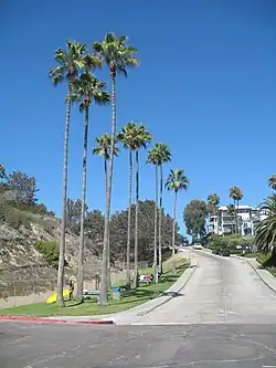 Tourmaline Surfing Park is less than 1000 feet west of the point where Tourmaline Street crosses La Jolla Boulevard. Reaching the park involves a steep, palm-lined descent through Tourmaline Canyon to a fairly large parking lot, which is slightly elevated but situated right beside the beach. There are showers and restrooms, as well as railings and places to sit.[1]