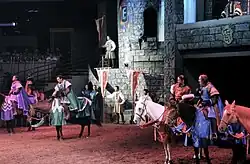 In King Arthur's Tournament, a young horseback-riding boy dismounts and sleeps in the country, wishing to become a knight. Merlin fulfills that wish, turning the boy into Jeffrey, the white knight.[35][36] The arena is split into several sections, each corresponding to a location such as Kent, Saxony, Nottingham, and Aquitaine.[37] The villainous black knight and a midget antagonize the white knight and his potential princess. Draped in a blue robe, Merlin encourages the audience to loudly boo the antagonists and support their knight.[38] He demonstrates to them how to say "Huzzah" when cheering for their knight.[4] The knights from each section joust to secure the privilege of proposing to the princess, and horseback riders who are speared fall off their horses.[39] During the fighting, Merlin teases and excites the audience including ribbing a woman to "meet me after the show".[38][39] Merlin acts as the narrator for the drama, attempts to rebuff the dwarf by lighting a fire under his backside, and throws thunderbolts.[37][40] Women who evoke the Romani people dance. The black knight returns repeatedly for battle and is defeated.[38] The white knight proposes to the princess, Guinevere, who accepts.[38][37] The around 25 cast members host an extravagant wedding parade. Fireworks and lasers go off as the performers exit the stage.[38]