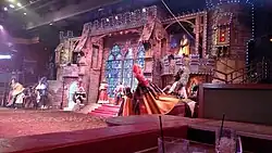 After undergoing an overhaul, King Arthur's Tournament was rebranded to Tournament of Kings and started doing shows again on February 4, 1999.[13][18] The creative team had been readying Tournament of Kings for almost a year.[14] Patrick Jackson was the new show's producer.[5] Following a $1.2 million upgrade, the show had a revamped arena, a modernized set, and opulent costumes.[5] An additional $1 million went to other changes.[5][13] The show's 1999 renovation resulted in new chandeliers, fresh carpets, and fresh paint.[13] The venue installed gargoyles and redesigned the layout so that the audience members could no longer see the stations where the food was heated.[14] Plastic benches were supplanted by upholstered furniture, and an improved setup for lighting and sound was installed.[13] To accommodate people who are disabled, the venue installed an elevator.[13] Previously, the performers went in and out of the arena through a small black curtain.[13] The renovated arena replaced the curtain with a stone castle containing turrets and parapets on which the antagonistist Mordred hurls flames and the cast clashes using swords.[13] Gregory Crane designed the set.[19] Ivan Caulier served as stunt coordinator, a role he had done since the show's 1990 premiere.[20] The cast members took acting classes to make their performances more realistic.[14]