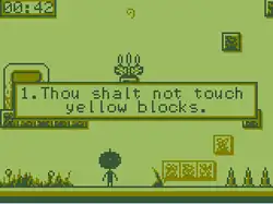 The game begins in medias res, after Eid has entered the Tower of Heaven. A disembodied voice warns them of the danger in scaling the tower. When Eid continues, the voice explains that Eid will need to prove they are worthy by navigating various dangerous obstacles. After they successfully proceed deeper into the tower, the voice is surprised Eid survived, and decides to make things more "amusing" by giving them a stone tablet, the Book of Laws, that must be obeyed if the protagonist is not to be immediately smitten. In each subsequent room, it imposes various arbitrary laws, such as "thou shalt not walk left", and not being able to touch organic life such as butterflies and plants. As Eid continues to progress, the voice becomes more and more angry that Eid is able to circumvent the rules, calling Eid "covetous" and deserving of death. The Book of Laws shatters, and Eid navigates a final platforming challenge to reach the tower's peak. There, Eid meets a butterfly representing the deity-like being, which reacts with disdain that Eid has managed to plunder the riches of the tower. Saying it is "content", but that Eid cannot continue into heaven, the butterfly collapses the entire tower to the ground. The graphics switch to full color, showing the journal entry of a witness to Eid's journey to the tower.